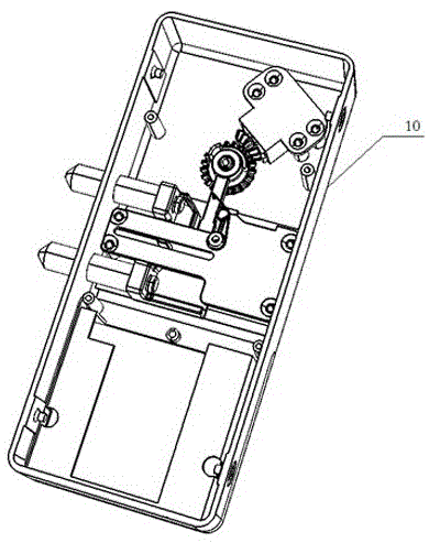 當使用轉動開鎖時,由于門內旋鈕50與撥桿60之間限位連接,通過旋轉金屬底座10背面的門內旋鈕50,使撥桿60與門內旋鈕50同步運動,撥桿60在滑板70的u型槽72中呈90°轉動,滑板70通過u型槽72在金屬底座10的導軌13上左右移動,固定在滑板70上的插銷71隨著滑板70一起運動,完成開閉插銷71的動作。因為旋鈕齒輪40以門內旋鈕50上的主軸51做軸心轉動,兩者之間沒有同步約束結構,在門內開閉鎖時電機20不會轉動,從而達到節能和保護電機20的目的。